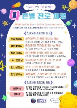 진로 체험은 학교 급별로 초등학생은 24일과 27일에 기본 이동형 방식(40분씩 2개 체험실 선택)으로, 중학생은 23일과 26일에 심화 집중형 방식(80분간 1개 체험실 선택)으로 운영된다.