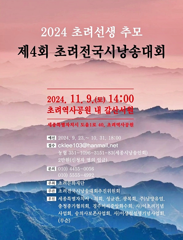 [충청뉴스 조홍기 기자] 세종특별자치시에 있는 초려문화재단(이사장 이연우)이 초려 이유태 선생의 뜻을 기리는 ‘제4회 초려전국시낭송대회’를 개최한다.