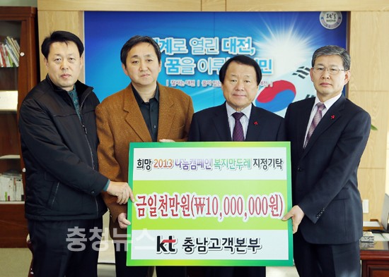 이날 김재현 KT 충남고객본부장과 조중오 충남지방본부위원장은 일천만원을 위기가정 지원사업비로 기탁했다.