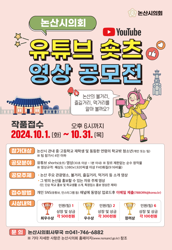 이번 영상 공모전 관련 기타 자세한 사항은 논산시의회 홈페이지를 참고 하거나, 의회사무국 의정홍보팀(☎041-746-6882)으로 문의하면 된다.