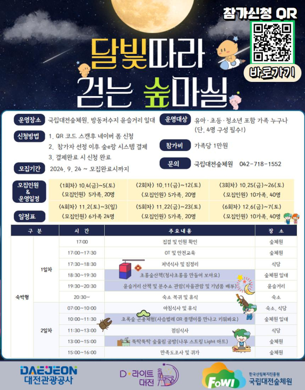 [충청뉴스 김용우 기자] 대전관광공사는 국립대전숲체원과 협력해 대전의 풍부한 산림자원과 방동 윤슬거리를 활용한 야간 특성화 캠프 ‘달빛 따라 걷는 숲마실(달마실)’을 운영한다고 밝혔다.