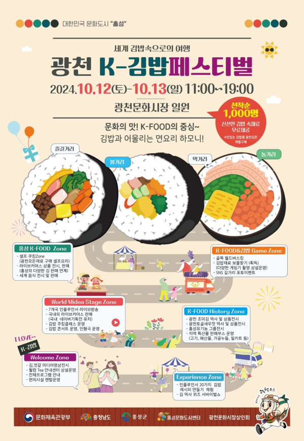 특히 ▲광천 조미김과 광천 젓갈의 역사를 소개하는 전시회 ▲7개국 25명의 인플루언서 거리 라이브 방송 및 광천문화시장의 먹거리, 특산물 소개 ▲김밥과 광천의 관광을 소개하는 골목 문화의 멋 김밥재료 보물찾기 등도 눈에 띈다.