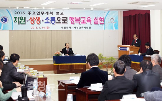 대전광역시서부교육지원청(교육장 노평래)은 14일 10시부터 서부교육지원청 3층 대회의실에서 김신호 대전광역시교육감, 관내 초․중 교장 대표와 지역중심학교장, 관내 학교운영위원회 지구별 협의체 위원장, 공립유치원협의회장, 사립유치원협의회 회장 등이 참석한 가운데 2013년도 주요업무계획을 보고했다.