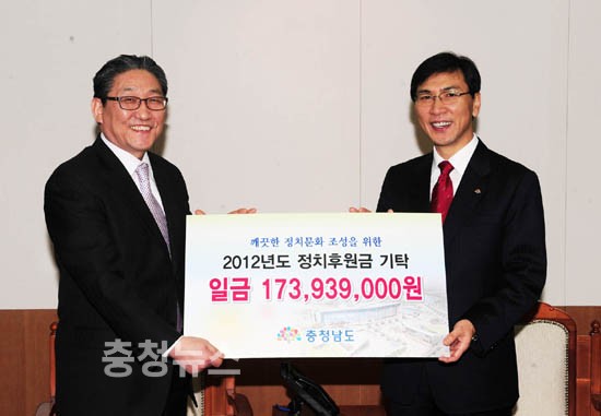 안희정 충남도지사는 15일 도청 접견실에서 장기찬 도 선거관리위원회 상임위원에게 도 소속 공무원을 대상으로 모금한 소액다수 정치후원금을 전달했다.