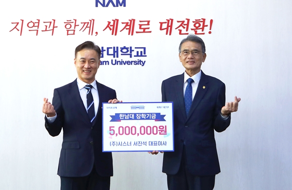 이날 오전 장학기금 전달식이 열렸으며, ㈜시스너 서진석 대표는 이승철 한남대 총장에게 모교 발전을 위한 ‘산업경영공학과 장학기금’ 500만원을 전달했다.