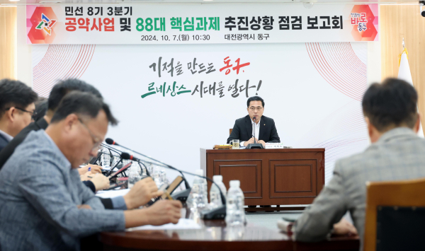 [충청뉴스 박영환 기자] 대전 동구는 7일 구청 대회의실에서 2024년 3분기 ‘민선 8기 공약사업 및 88대 핵심과제 추진 상황 보고회’를 개최했다고 밝혔다.