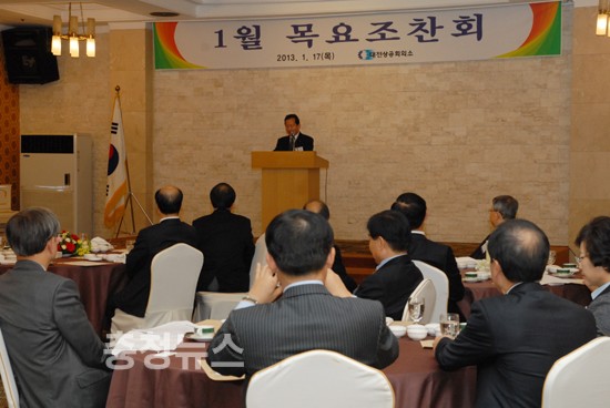 대전상공회의소(회장 손종현)는 17일 오전 7시 30분 유성호텔 3층 킹홀에서 지역발전을 선도하는 기관단체장들의 최대 정례교류회인 ‘2013년 1월 목요조찬회’를 개최하고, 계사년 새해의 건승을 다짐하며 지역 경제 발전을 위한 상호 의견을 교환했다.