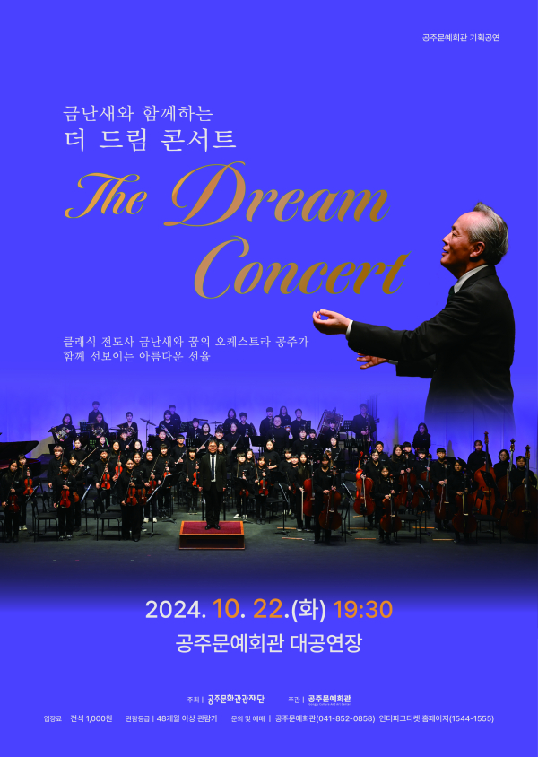 [충청뉴스 공주 = 조홍기 기자] (재)공주문화관광재단(대표이사 김지광)은 오는 10월 22일(화) 공주문예회관 대공연장에서 공주문예회관의 기획공연 ‘금난새와 함께하는 <더 드림 콘서트>’를 선보인다.