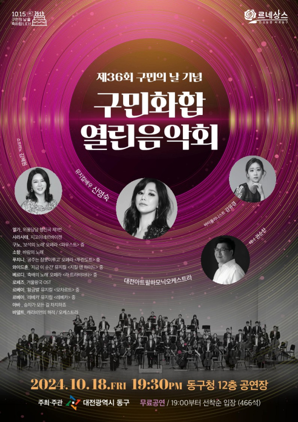 [충청뉴스 박영환 기자] 대전 동구는 오는 18일 오후 7시 30분 동구청 12층 공연장에서 제36회 구민의 날을 기념해 ’구민화합 열린음악회‘를 개최한다.