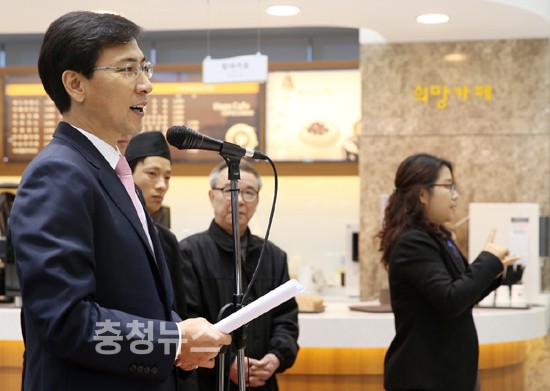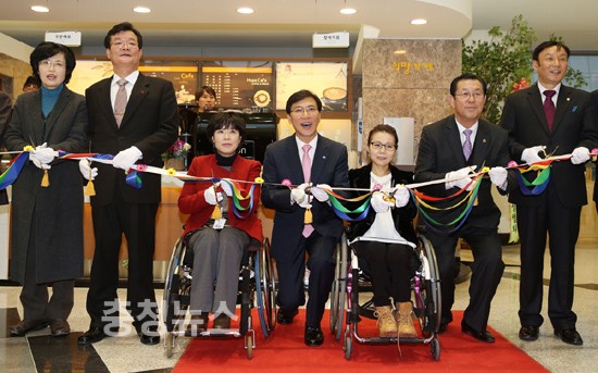 충남도 내 장애인들이 장애인 생산품을 팔며 스스로 일자리를 만들고 자활을 꿈꾸는 ‘희망카페’가 21일 도청사 본관 1층에서 오픈 기념식을 열고 본격 운영을 시작했다.