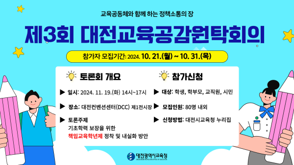 [충청뉴스 이성현 기자] 대전시교육청은 11월 19일 오후 2시 대전컨벤션센터에서 ‘기초학력 보장을 위한 책임교육학년제 정착 및 내실화 방안’이라는 주제로 개최되는 ‘2024년 제3회 대전교육공감원탁회의’에 참여할 토론참여자를 모집한다고 밝혔다.