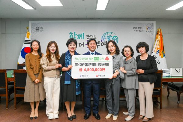[충청뉴스 부여 = 조홍기 기자] 부여군(군수 박정현)은 충남어린이집연합회 부여군지회(회장 김영란)가 관내 저소득 아동 가구 지원을 위한 이웃돕기 성금 450만 원을 기탁했다고 밝혔다.