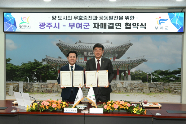 [충청뉴스 부여 = 조홍기 기자] 부여군(군수 박정현)은 경기 광주시(시장 방세환)와 지난 22일 광주시청에서 상호발전을 위한 자매도시 협약을 체결했다.