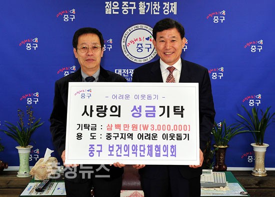 대전시 중구 보건의약단체협의회(회장 오호균)는 31일 중구(구청장 박용갑)청을 방문하여 어려운 이웃 지원을 위한 사랑의 성금 3백만원을 기탁했다.