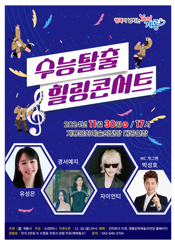 [충청뉴스 조홍기 기자] 계룡시(시장 이응우)가 오는 30일 계룡문화예술의전당에서 수능을 마친 수험생들을 위해 ‘수능 탈출 힐링 콘서트’를 개최한다고 밝혔다.