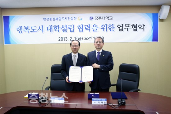 ▲ 이재홍(우측 세 번째) 행복도시건설청장과 서만철 공주대학교 총장이 1일 행복청 브리핑룸에서 행복도시 내 대학설립 협력을 위한 양해각서(M0U)를 체결한 뒤 기념촬영을 하고 있다.