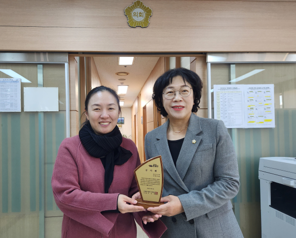 [충청뉴스 박동혁 기자] 김명숙 천안시의회 의원(더불어민주당, 비례)은 천안시휴브릿지주간보호센터 앞 인도 환경을 개선한 공로로 ‘사회복지법인 한빛인’으로부터 감사패를 받았다고 6일 밝혔다.