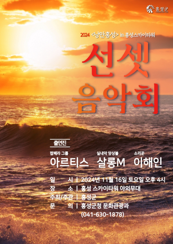 공연은 오후 4시부터 1시간 동안 진행되며, 홍성이 자랑하는 지역 출신 예술인들이 대거 참여한다. 팝페라 그룹 ‘아르티스’, 실내악앙상블 ‘살롱M’, 소리꾼 ‘이해인’이 출연해 다채로운 장르의 음악을 선보이고 서해안의 황홀한 낙조와 어우러진 특별한 무대를 선사할 예정이다.