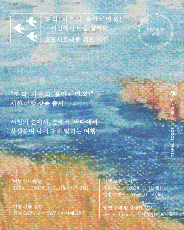 [충청뉴스 서천 = 조홍기 기자] 서천군은 지난 11일부터 서천의 섬, 숲, 바다를 테마로 한 ‘다이벌스(Diverse) 서천 : 또 와, 자주 와, 틈만 나면 와’ 여행 상품을 선보인다.