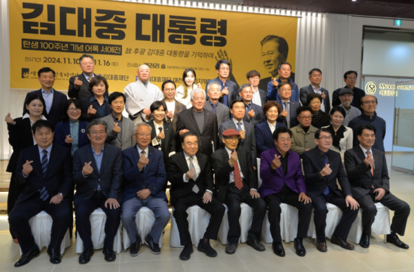 서예전 오는 16일까지 김대중 대통령님의 친필 서예작품 23점, 이희호 여사님의 작품 1점과 더불어 서예 작가 53명과 정치인 3명이 김대중 대통령님의 어록을 담은 서예 작품을 출품하여 총 80점의 서예 작품이 전시된다.