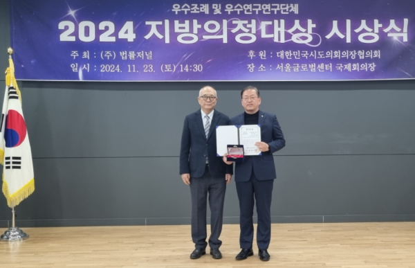 [충청뉴스 최형순 기자] 세종특별자치시의회 유인호 의원(더불어민주당, 보람동)이 지난 23일 서울글로벌센터 국제회의장에서 열린 법률저널 주최 2024년 지방의정대상 시상식에서 정책연구부문에서 최우수상을 받았다.