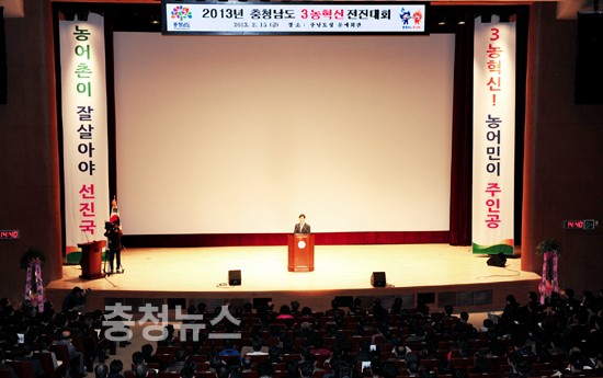 충남도내 농어업인들이 한자리에 모여 3농혁신 성공 추진을 다짐하는 ‘제1회 3농혁신 전진대회’가 15일 오후 2시 도청 문예회관에서 열렸다.
