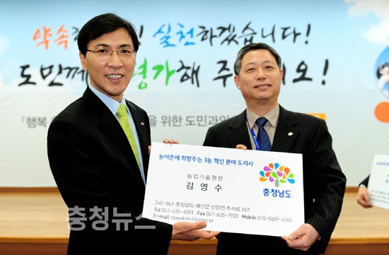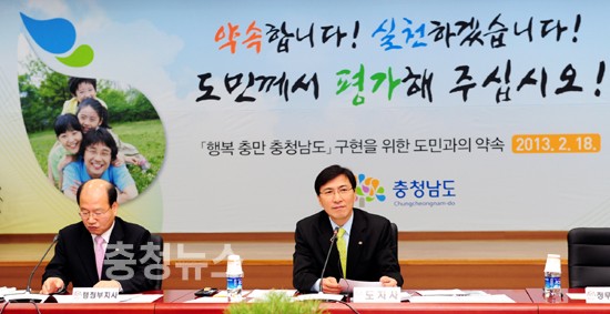 약속식은 각 실·국장이 민선5기 충남도의 8대 역점과제를 중심으로 올해 자신의 전략적 과제를 선정·제시하면, 확인자인 안 지사와 평가자인 양 부지사, 입회인인 도민 대표 등이 질문하거나 의견을 제시한 뒤 약속서에 서명하는 방식으로 진행됐다.