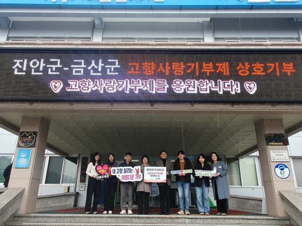 11월 29일 이재곤 금산군청 세계화담당관, 임진숙 진안군청 행정복지국장 등 관계자 8명은 진안군청에서 각 지자체의 고향사랑기부제 활성화 방안을 논의하고 두 지역의 희망 공무원들의 상호교차 기부를 진행했다.