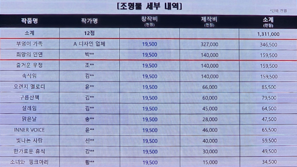 천 의원이 제출받은 조형물 세부 내역. 12점의 예술작품 창작비용이 동일하게 책정됐고, 이 중 2개의 조형물 작가가 아산시 도시디자인 특보인 것으로 드러났다./천 의원 제공