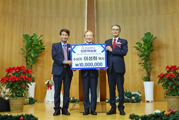 한남대 인돈학술원(원장 조용훈)은 3일 오후 2시 정성균선교관에서 제30회 한남인돈문화상 시상식을 개최했다. 한남대 이승철 총장과 학교법인 대전기독학원 곽충환 이사장은 이성희 목사에게 상패와 상금 1000만 원을 전달했다.
