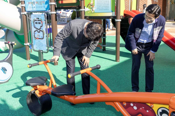 최충규 대덕구청장이 새롭게 조성된 읍내놀이터 현장을 점검하고 있다.