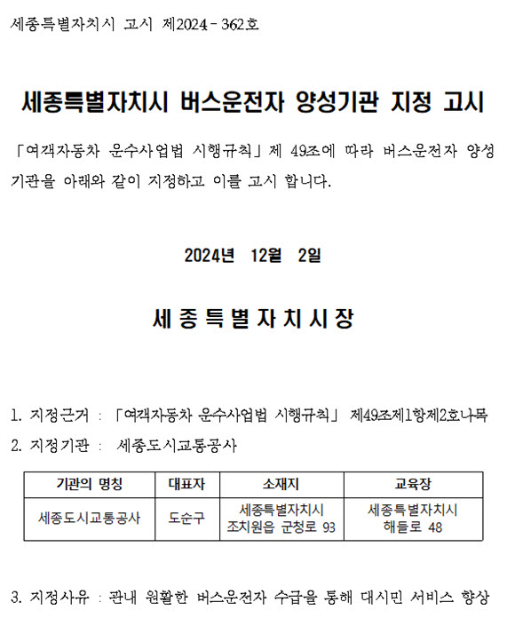 [충청뉴스 최형순 기자] 세종도시교통공사(사장 도순구)는 4일 "그동안 자체적으로 운영해오던 “교통사관학교”를 전국 지방공기업 중 최초로 운수종사자 양성기관으로 지정 받아 교육생 모집을 시작했다"고 밝혔다.