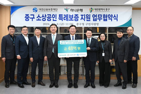 [충청뉴스 박영환 기자] 대전 중구는 소상공인 경영안정자금을 지원하기 위해 지난 6일 대전신용보증재단, 하나은행과 협약을 맺어 총 48억 원 규모의 소상공인 특례보증을 지원한다고 밝혔다.