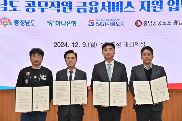 [충청뉴스 권상재 기자] 충남도는 9일 도청 대회의실에서 하나은행, 서울보증보험, 충청남도공공노동조합 충남도청지회와 ‘충청남도 공무직원 금융서비스 지원’ 업무협약을 체결했다.