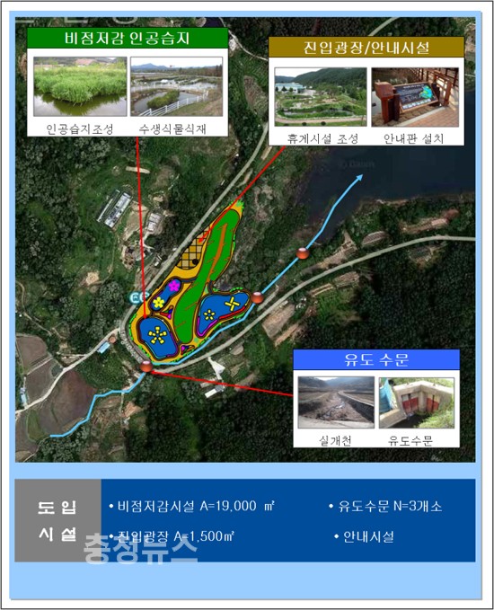 금번 사업은 오는 3월에 기본 및 실시설계용역을 착수하여 주민들의 의견수렴과 금강유역환경청․한국환경공단과의 협의를 거처 5월말까지 완료하고, 오는 6월에 착공하여 인공습지형 비점오염저감시설 19,000㎡를 금년 말 준공을 목표로 추진되며 사업비는 27억5000만원이 투자되는 사업이다.