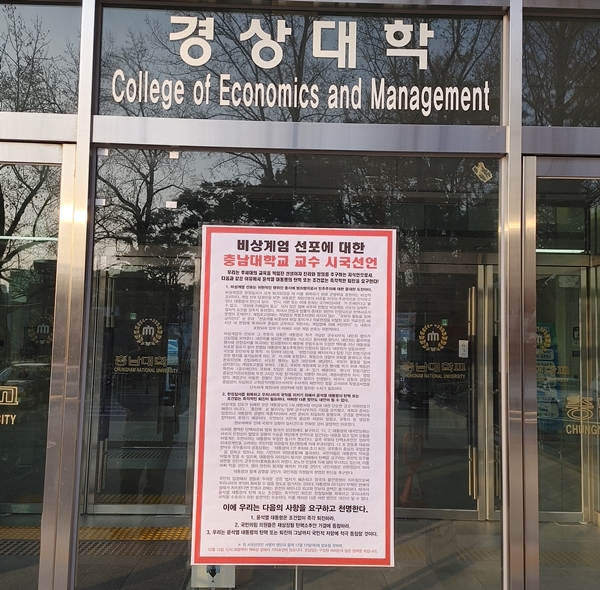 충남대 교수들은 10일 교내 1·2·3학생회관과 경상대 출입문에서 시국선언문을 개시하고 대통령 탄핵 또는 즉각적인 퇴진을 촉구했다.