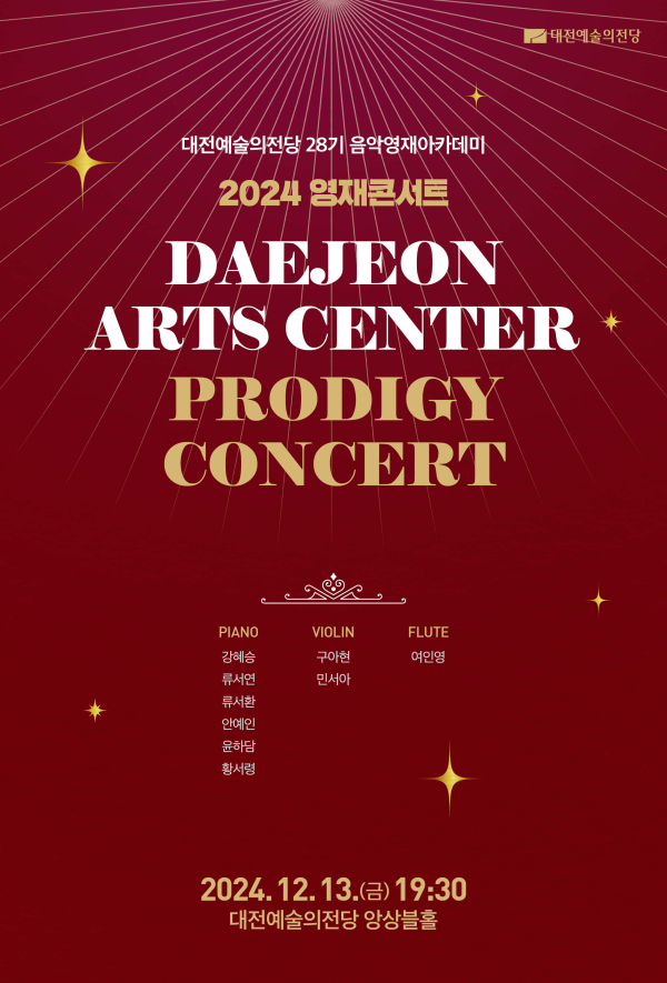 [충청뉴스 박영환 기자] 대전예술의전당(관장 김덕규)은 오는 13일, 28기 음악영재아카데미 수강생 중 성적 우수자 9명의 영재콘서트를 개최한다고 밝혔다.