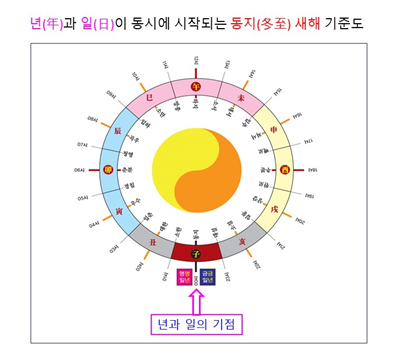 매년의 새해[歲首]는 입춘(立春)으로 정하고, 매일[日]의 시작[日首]은 00 시점으로 정하면, 위 표에서 확인했듯이 년과 일이 약 45도 떨어진 곳에서 제각각 시작된다. 이는 입춘부터 을사년 뱀띠가 시작된다고 하는 주장은 오류임을 입증하는 명확한 근거가 된다.