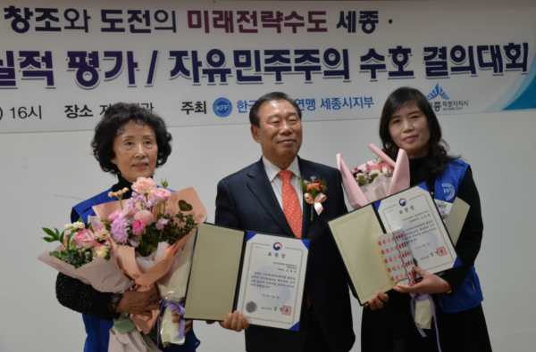 국회의원 표창(3명) : 정해석 운영위원. 옥치국 다정동위원장, 김선화 여성협의회 총무, △임채성 세종시의회 의장 표창(4명) : 이미연 여성협의회 부회장, 이명희 부강면 위원장, 황단의 전의면 부위원장, 이정원 소담동 회원 △ 한국자유총연맹 총재 표창 (8명) : 신만덕 조치원 회원, 정희자 연기면 회원, 오이순 연서면 회원, 신용희 도담동 회원, 장양훈 새롬동 회원, 황경순 대평동 회원, 한규분 다정동 회원, 유미자 소담동 회원 등이다.