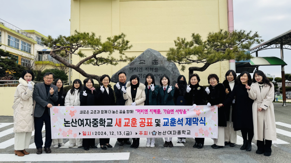 [충청뉴스 논산 = 조홍기 기자] 논산여자중학교(교장 최은주)는 13일 동창회, 학부모, 학생, 교직원이 참석한 가운데 새로운 가치를 담은 교훈 ‘머리엔 지혜를 가슴엔 사랑을’을 선포하고 교훈석 제막식을 개최하였다. 이번 제막식은 제63회 개교기념일에 맞춰 개정한 새로운 교훈의 의미를 새기고 알리기 위해 마련된 자리였다.