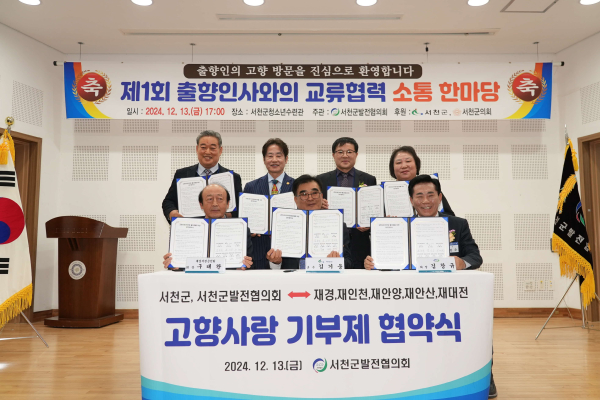 특히 고향사랑기부제 활성화를 위한 업무협약식에서는 구태완 재경서천군민회장, 백세기 재인천서천군민회장, 김종복 재대전서천군민회장, 나현숙 재안양서천군민회장, 박희수 재안산서천군민회장이 협약서에 서명하며 상호 협력을 약속했다.