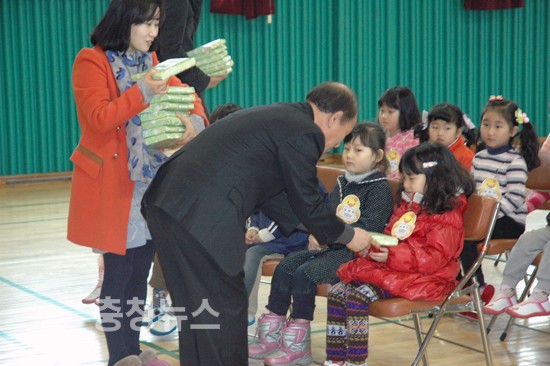 ▲ 전동초 정지원교장은 입학식에서 선물을 전달