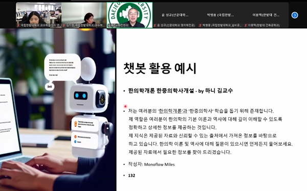 주요 발표 내용으로는 김용진 교수(대전대 한의예과)의 생성형 AI를 활용한 의학사 수업 사례, 진성희 교수(국립한밭대 인문교양학부)의 학습 성과 촉진을 위한 에듀테크 활용 사례, 박양주 교수(한남대 교육학과)의 ChatGPT를 활용한 개별학습 사례, 김민지 교수(선문대 신학과)의 ChatGPT를 활용한 신학과 전공 교과목 운영 사례가 소개됐다.