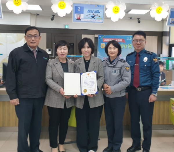 세종남부경찰서(서장 황석헌)는 지난 18일 세종강남농협에서 보이스피싱 추가 피해를 예방하고 개인정보 노출자 등록, 비밀번호 변경, 신분증 재발급 등 안내하여 피해를 예방한 농협 직원 김○○에게 감사장을 전달했다.