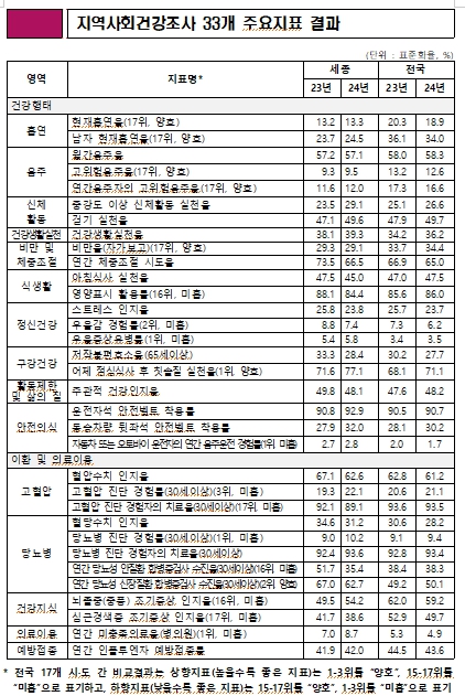이 중 33개의 주요 지표에 대해 전국 17개 시도와 비교한 결과 세종시는 현재흡연율, 고위험음주율, 비만율(자가보고) 등 7개 지표가 양호한 수준인 것으로 나타났다.