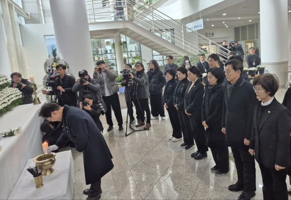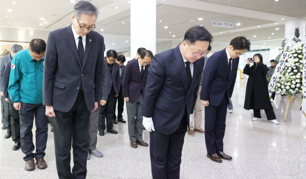 [충청뉴스 김용우 기자] 30일 대전시청 1층에 마련된 '제주항공 여객기 사고 희생자 합동분향소'에 이장우 대전시장과 박범계(서구을) 더불어민주당 의원 등 지역 정치인들의 조문 행렬이 이어지고 있다.