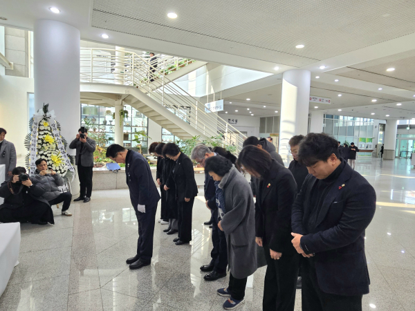 박범계 민주당 의원과 서구을 지역 전현직 지방의원들이 시청 합동분향소에서 여객기 참사 희생자들에 대해 애도를 표하고 있다.