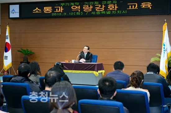 세종특별자치시(시장 유한식․이하 세종시)는 12․13일 이틀 간 시청 대강당에서 시 산하 무기계약 및 기간제 근로자 164명을 총 2기로 나눠 ‘소통과 역량강화 교육’을 실시했다.