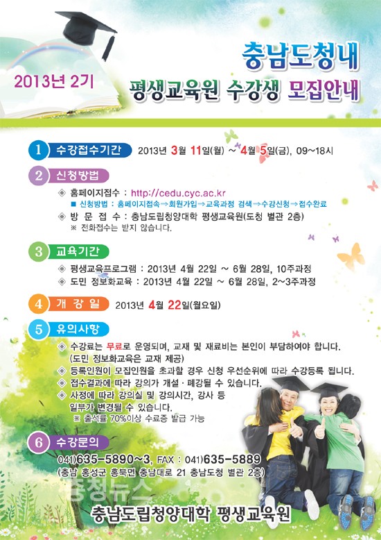 충남도립청양대학(총장 최석충)은 도민의 삶의 질 향상을 위한 평생교육의 확대로써 지난 1기 과정에 이어 상반기 2기 프로그램 41개 과정에 대하여 3월 11일부터 4월 5일 까지 정원 960명의 수강생을 모집 중이다.