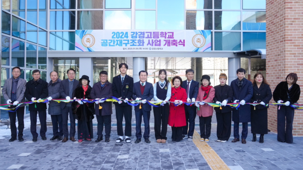 [충청뉴스 권상재 기자] 강경고등학교는 9일 공간재구조화사업에 따른 개축 공사를 마무리하고 사제동행관(체육관)에서 준공식을 개최했다.